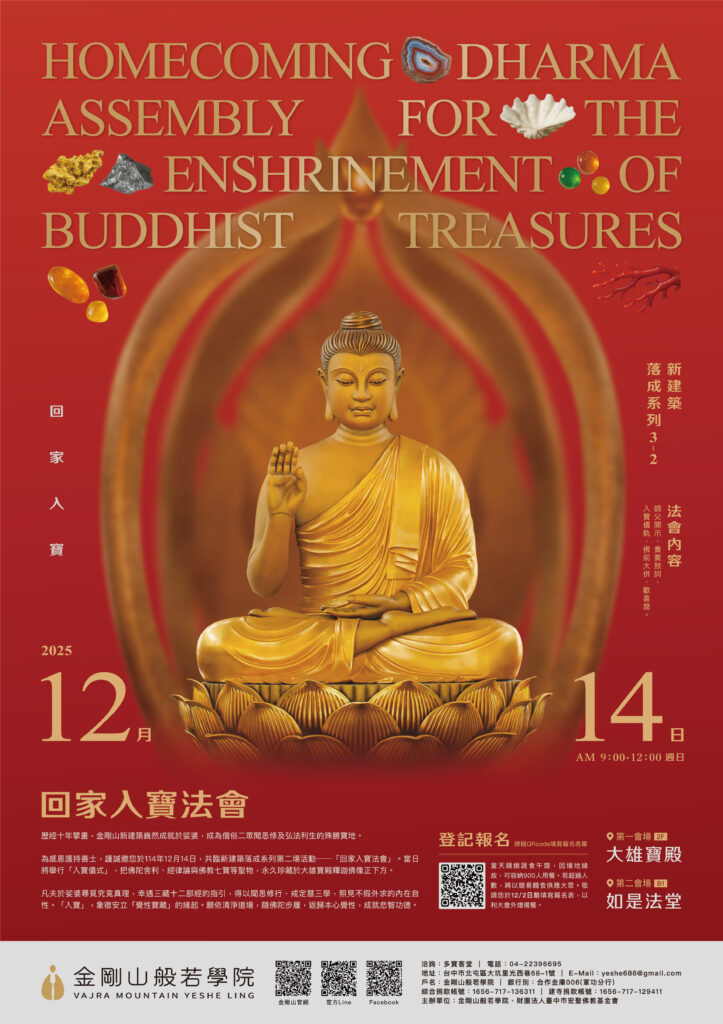 為感恩護持善士,謹誠邀您於114年12月14日,共臨新建築落成系列第二場活動—「回家入寶法會」。當日將舉行「入寶儀式」,把佛陀舍利、經律論與佛教七寶等聖物,永久珍藏於大雄寶殿釋迦佛像正下方。